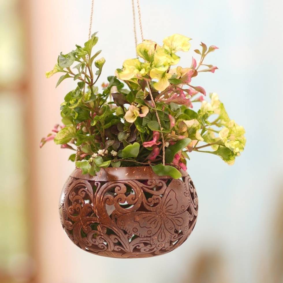 Handmade Coconut Shell Hanging Planter from Bali 'Tropical House in Butterfly' Item ID: 2671668509