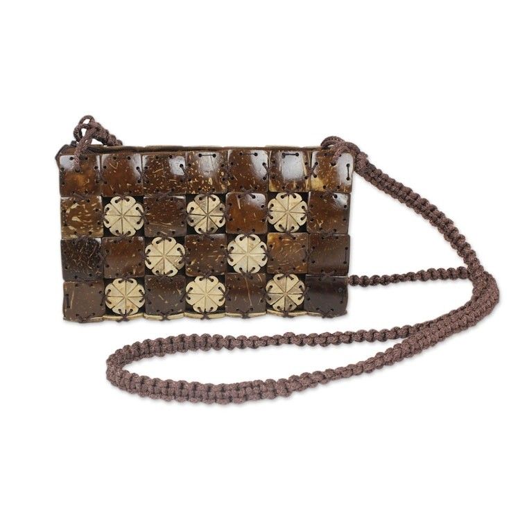 Handmade Coconut Shell Purse with Cotton Lining 'Flowers Squared' Item ID: 2671802088