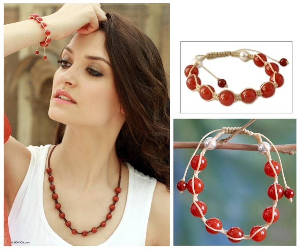 Handmade Cotton and Carnelian Shambhala-style Bracelet 'Meditate' Item ID: 2671794181