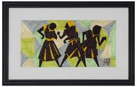 "Performing an energetic dance, three geometric silhouettes are depicted in this piece of wall art from Ghana. Randy Abeka Abbam creates this art, diligently laying silk threads in an intricate pattern to make the composition. This piece arrives within a cardboard mat and tweneboah wood frame."
