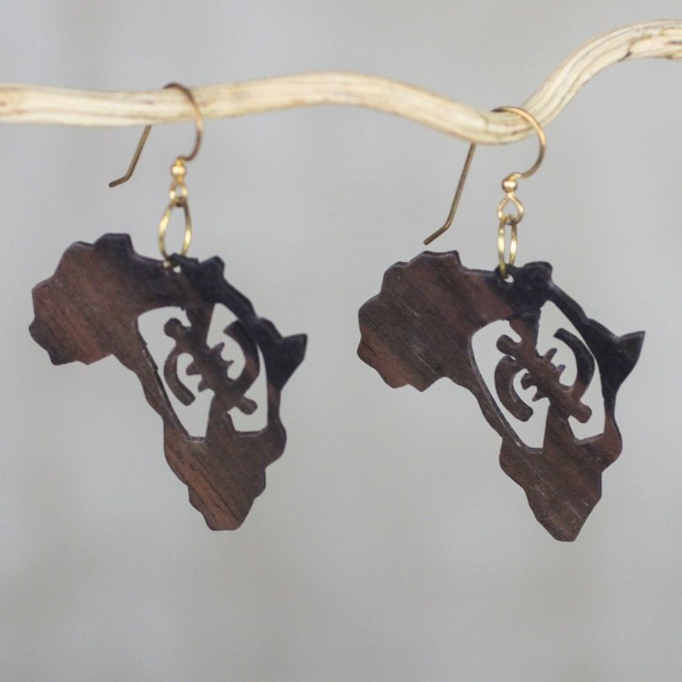 Handmade Ebony Wood Africa Map Dangle Earrings from Ghana 'Adinkra Africa' Item ID: 2671801123