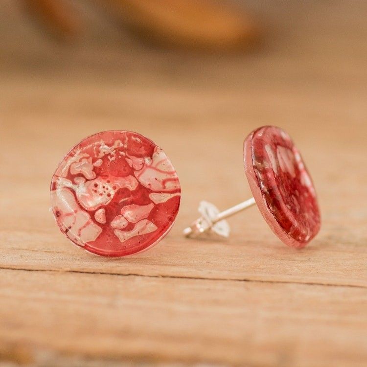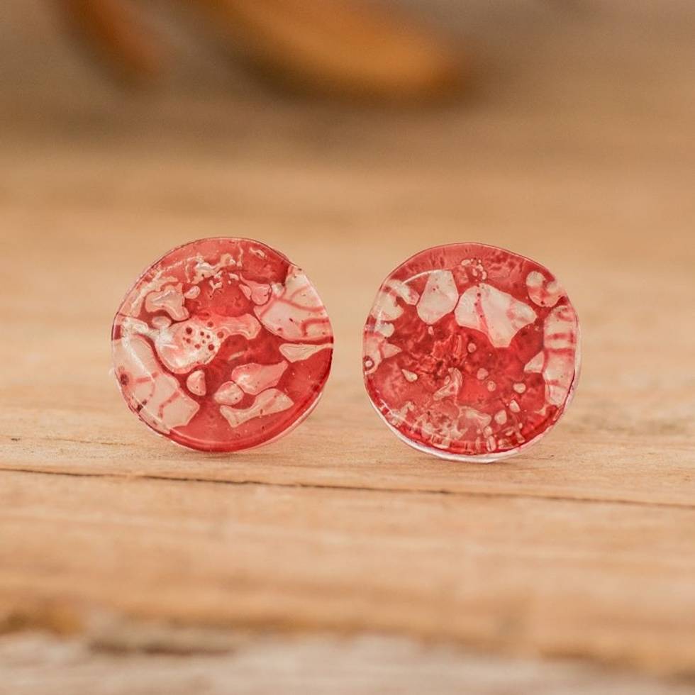 Handmade Eco-Friendly Round Red Recycled CD Stud Earrings 'Red Translucent Illusion' Item ID: 2671768951