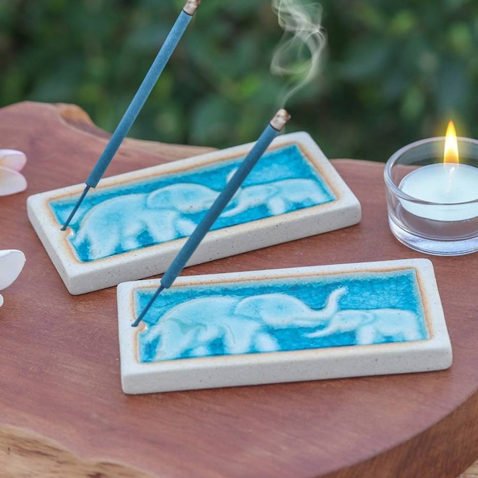 Handmade Elephant-Themed Blue Ceramic Incense Holders Pair 'Lucky Bond' Item ID: 2671646608