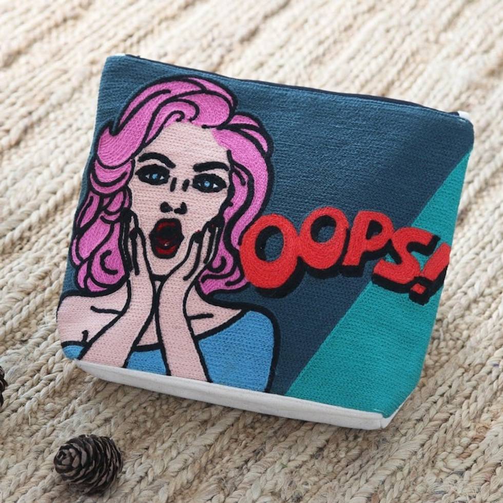 Handmade Embroidered Cotton Cosmetic Bag from India 'Oops Moment' Item ID: 2669944224