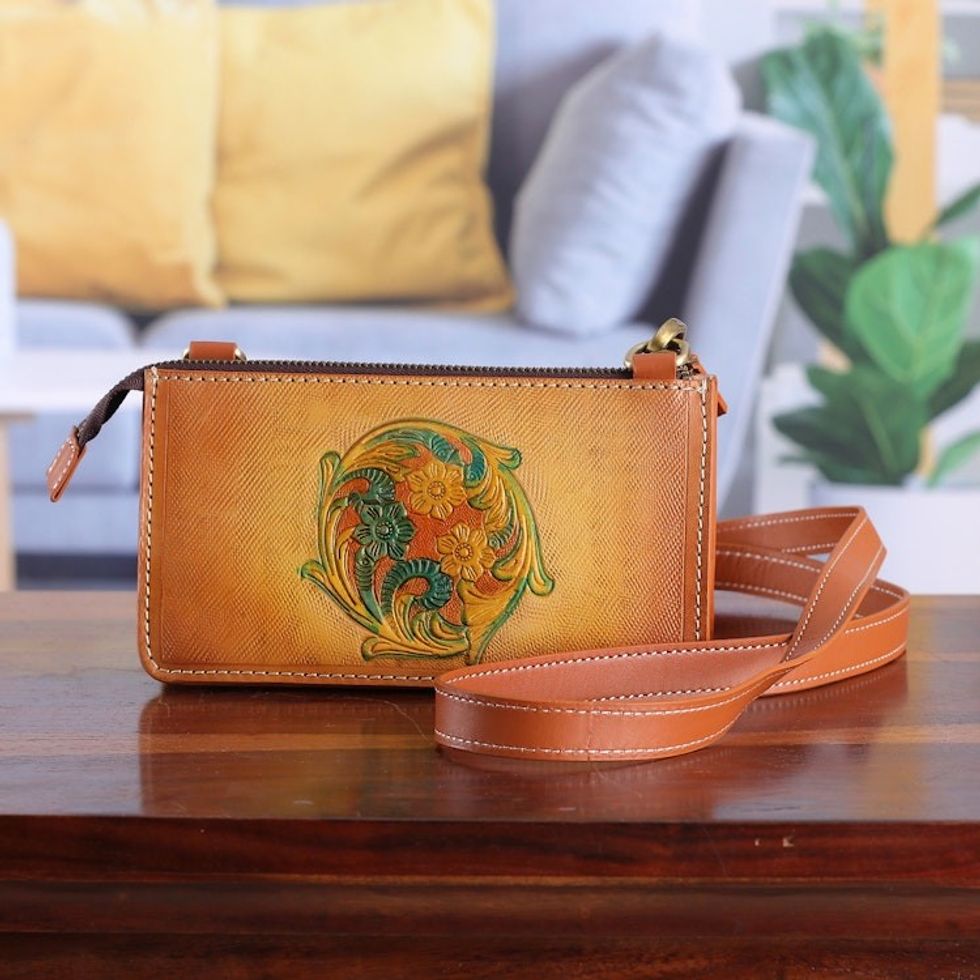 Handmade Floral Copper Brown Zippered Leather Clutch Sling 'Cycle of Summer' Item ID: 2671781490