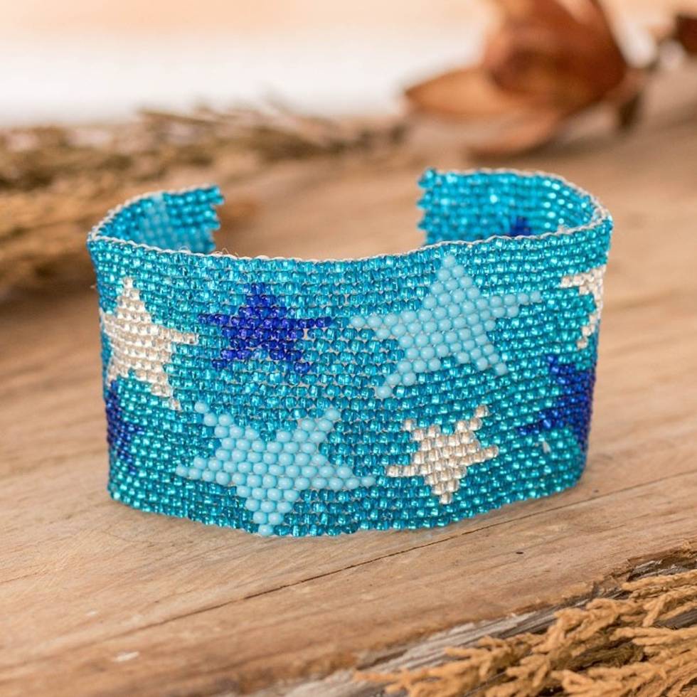 "Guatemala's Artisans of Panabaj capture the enchantment of a starry night in this wristband bracelet of sparkling glass beads. Gifted hands use nylon threads to weave each element into a graceful design, whose sky-blue hue embraces a star pattern. A blue crystal serves as a button clasp, allowing easy wear."