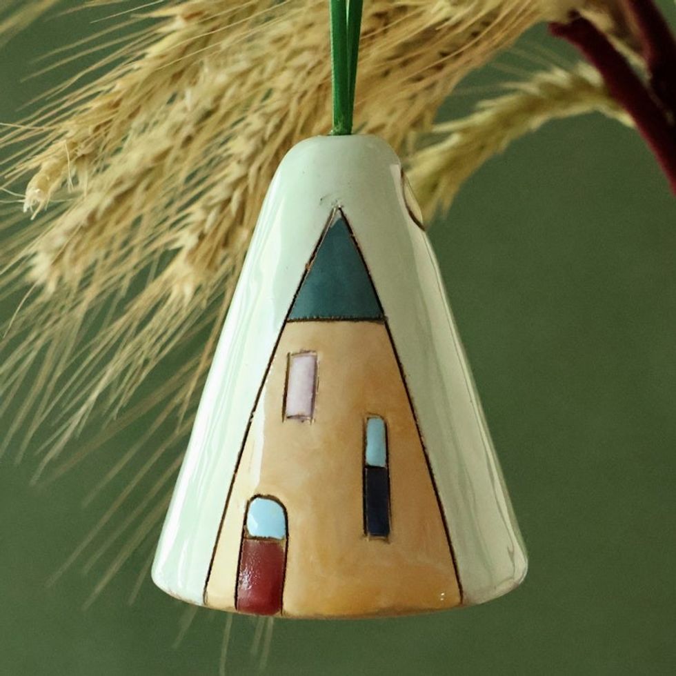 Handmade Glazed Ceramic Bell Ornament with House Motif 'House and Nature' Item ID: 2669941712