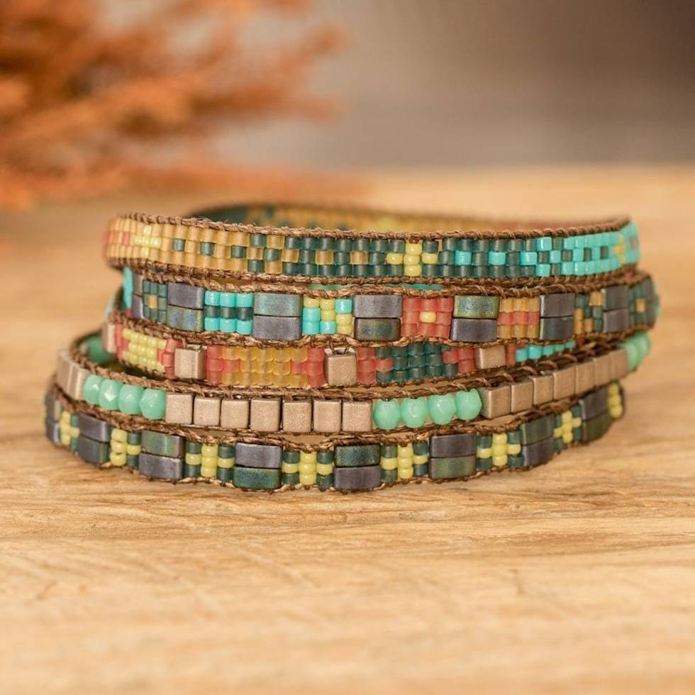Handmade Green and Turquoise Glass Beaded Wrap Bracelet 'Turquoise Lagoon' Item ID: 2669934144
