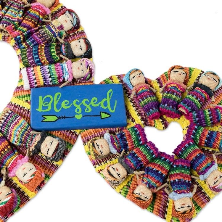 This wreath is beautiful and so well-made. I bought it to replace a wreath I had bought on a trip to Guatemala many years ago. The heart shape is adorable and the worry dolls are so cute. I love what they symbolize. Every time I look at this wreath, I smile. No worries!