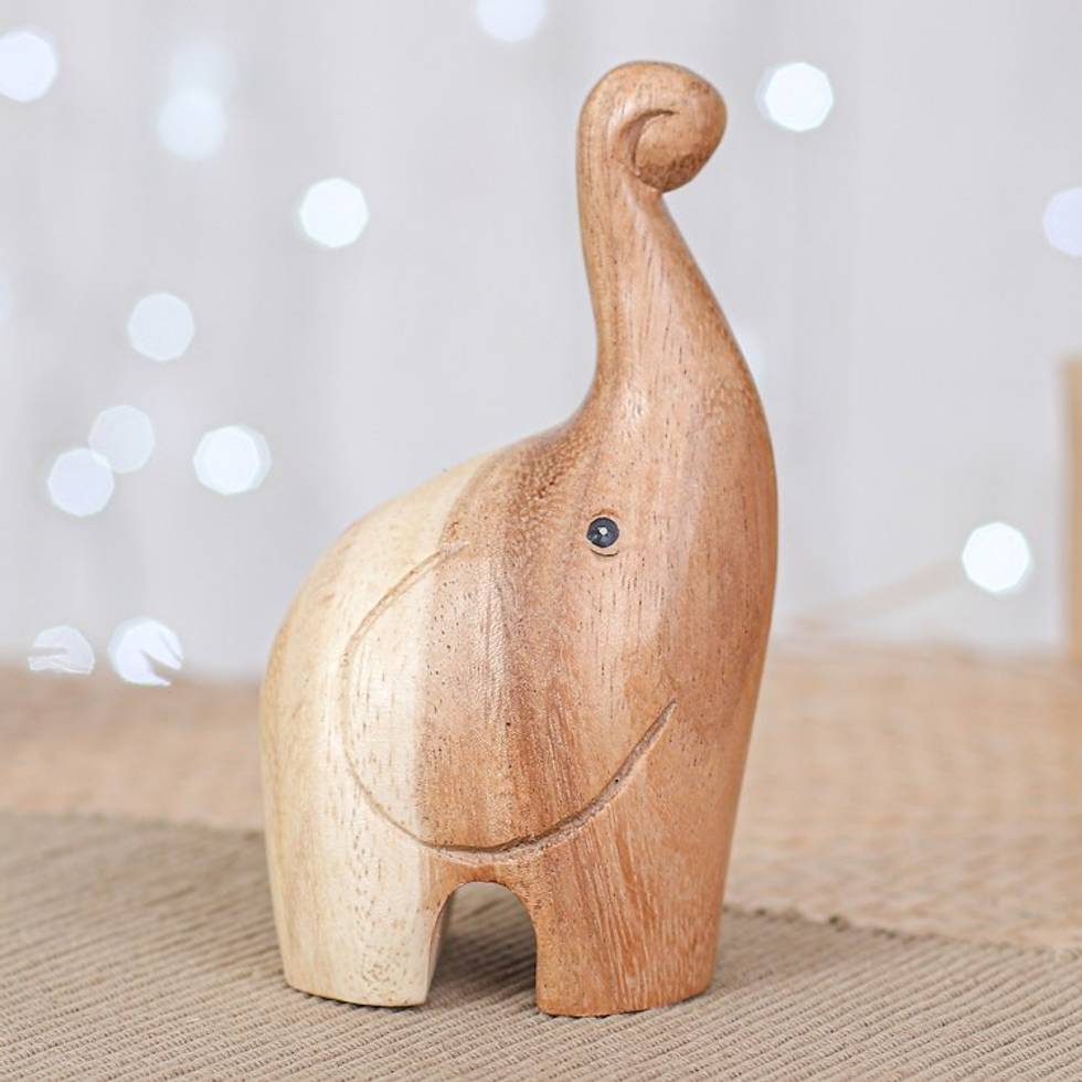 Handmade Happy Baby Elephant Raintree Wood Figurine 'Tiny Greeting' Item ID: 2671641371