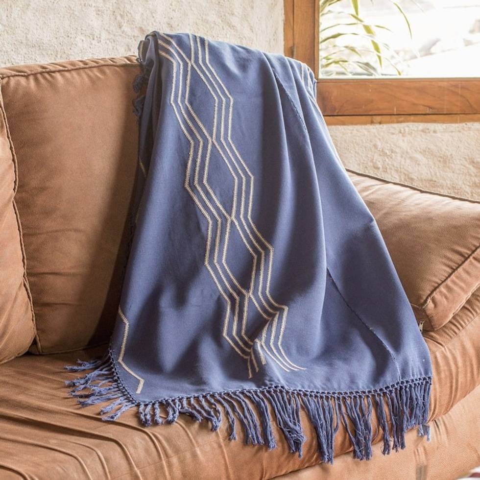 Handmade Indigo and Beige Cotton Throw with Geometric Motifs 'Indigo Ways' Item ID: 2671771628