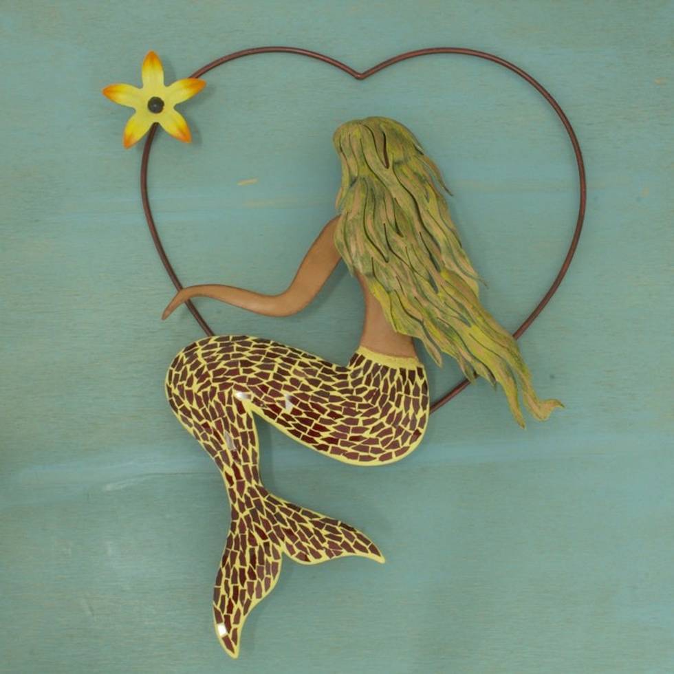 Handmade Iron and Glass Mosaic Mermaid Heart Wall Sculpture 'Mermaid Love' Item ID: 2671808887