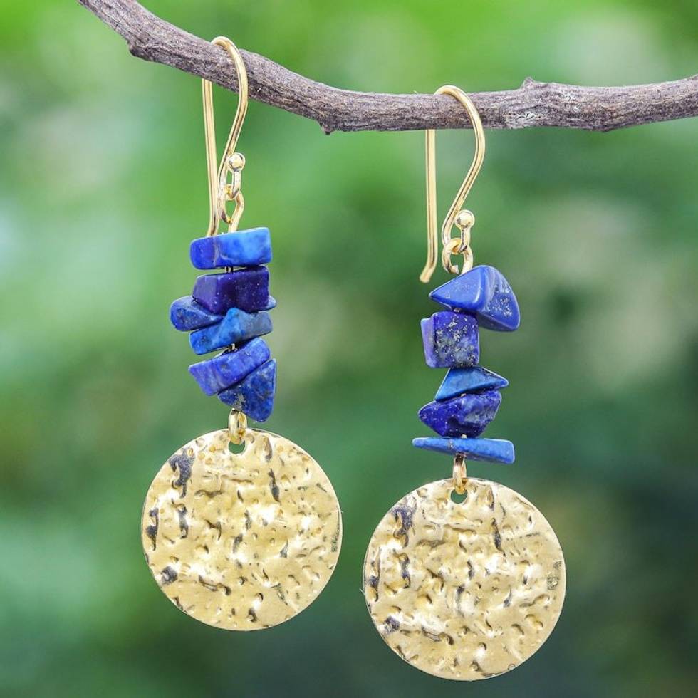 Handmade Lapis Lazuli Chip and Brass Coin Dangle Earrings 'Golden Coin in Blue' Item ID: 2669925895