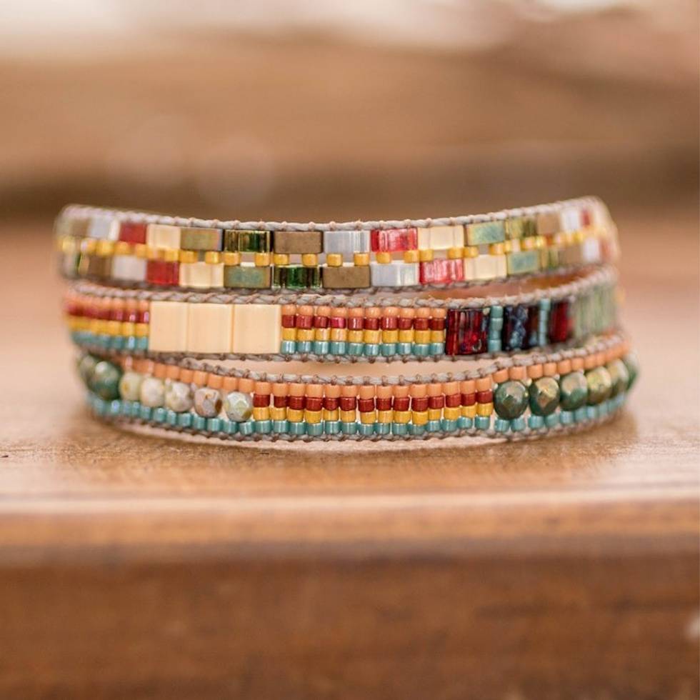 This is such a gorgeous bracelet. I love the variety of patterns and materials and the beautiful details: the woven parts and the lovely muted-colour beads create a pleasing overall effect. A lot of work goes into making these! It is such a fun piece that will be a joy to wear with relaxed, casual outfits. Thank you very much!
