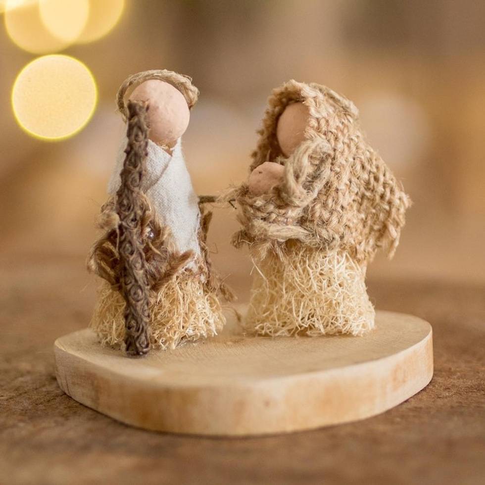 "Crafted from jute and agave fiber with accents of cotton, Joseph and Mary gather over baby Jesus. El Salvador's Marcela Moran creates this quaint nativity sculpture, which is displayed atop a round base of cortez wood."