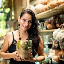 “My materials are mainly natural, such as jícaro (gourds), wood, cabuya, leather, seeds, and cotton fabrics, among others. I have a line of products in which I use recyclable materials such as glass bottles and containers, plastic containers, recycled fabrics, cardboard, and newspaper among many others. For the preparation of the jícaro, it is 100% traditional. It is collected when it is ready to harvest; then they are boiled in water for a period of 40 minutes for large jícaros, or 20 minutes for small jícaros. After this time they are removed from the heat. A hole is made in the upper part and all its pulp is removed with a tool made by hand with a metal rod. Another way to extract the pulp is by splitting the jícaro in half. After all this process, they are washed well and left to dry in the shade. My products contribute to caring for the environment with the use of 100% natural materials, which do not produce waste that pollutes. And secondly, we use only recyclable materials in one of our product lines, so we help with the reuse of material that many people discard. I am mainly inspired by nature, which is the main theme of my products. I love the rustic; it is one of the themes that also inspires me. All my art is beautiful; in all of them I have the challenge of designing from scratch. Each of my pieces is a real challenge because there are no identical ones--when working with mainly natural products, their shapes and sizes will never be the same.