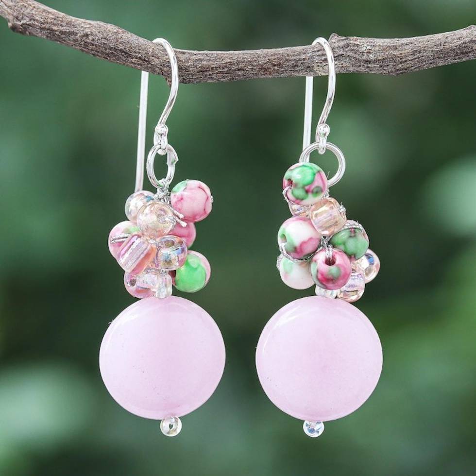 Handmade Quartz and Agate Dangle Earrings from Thailand 'Fun Circles in Pink' Item ID: 2669927797