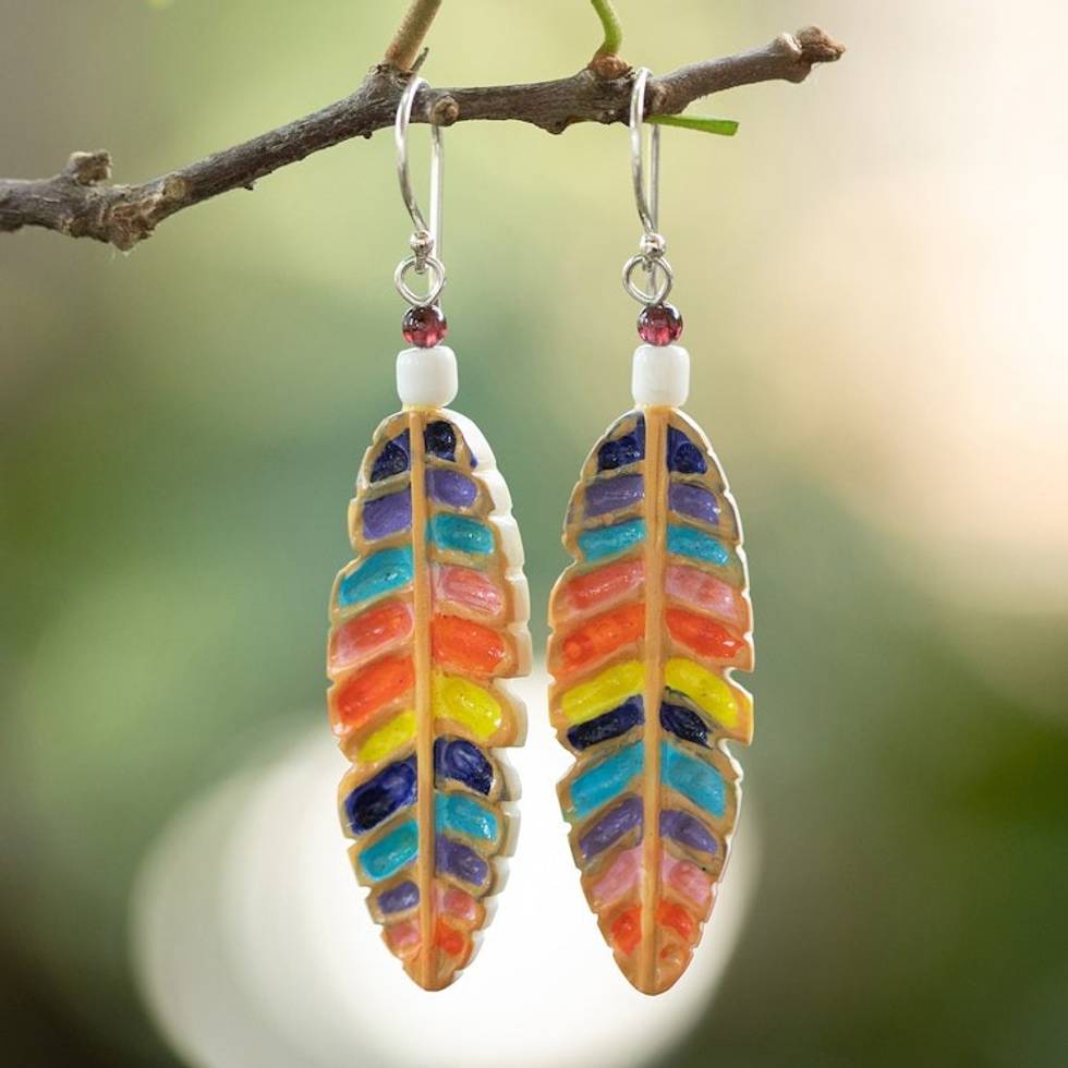 Handmade Rainbow Leafy Dangle Earrings with Garnet Beads 'Rainbow Leaves' Item ID: 2671765134