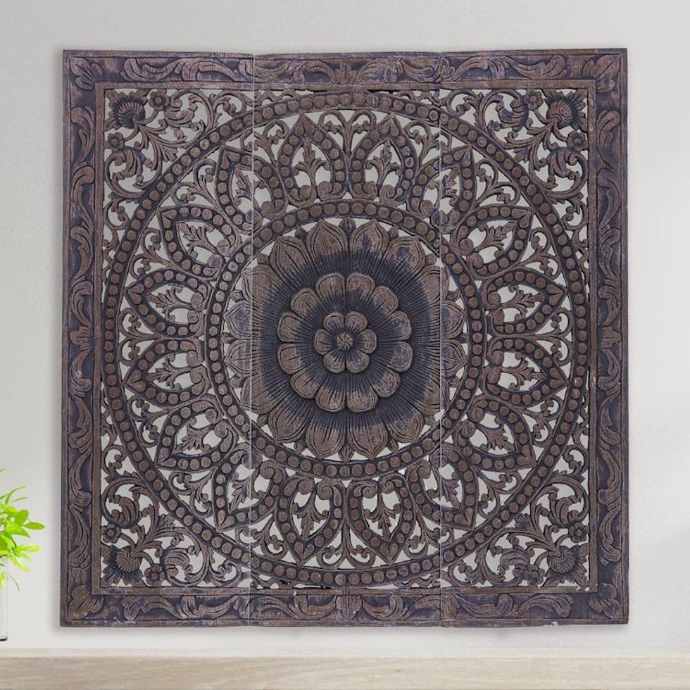 Handmade Reclaimed Teak Wood Relief Panels Set of 3 'Unfolding Lotus' Item ID: 2671799981
