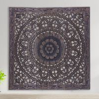 "Crafted from reclaimed teak wood, Eve Naewmaung designs a stunning vine and lotus flower motif using eco-friendly material. Thai artisans carry out her vision by hand carving intricate, openwork designs onto three panels, treating the surface with a rustic finish for a timeless look."