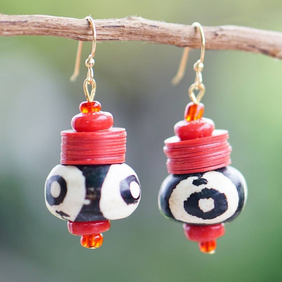 Handmade Recycled Glass Dangle Earrings in Red White Black 'Yawa' Item ID: 2671805452
