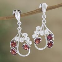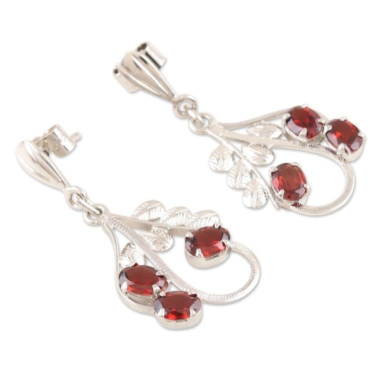 Handmade Rhodium-Plated Garnet Dangle Earrings 'Blazing Leaves' Item ID: 2671787993
