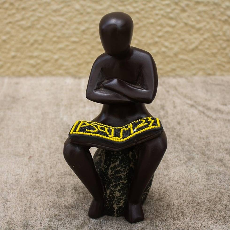Handmade Sese Wood and Glass Bead Sculpture 'Reading Scripture' Item ID: 2671816063