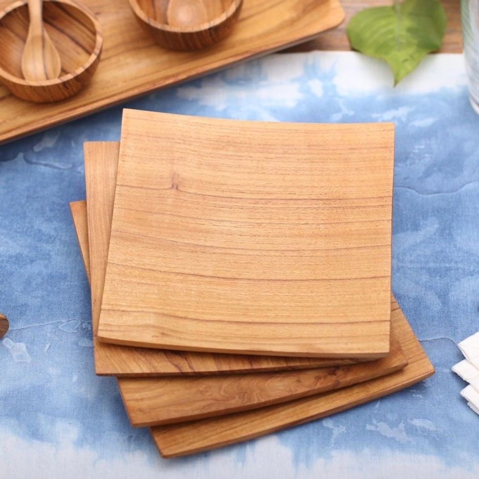Handmade Square Teak Wood Plates from Bali Set of 4 'Fine Meal' Item ID: 2671472532