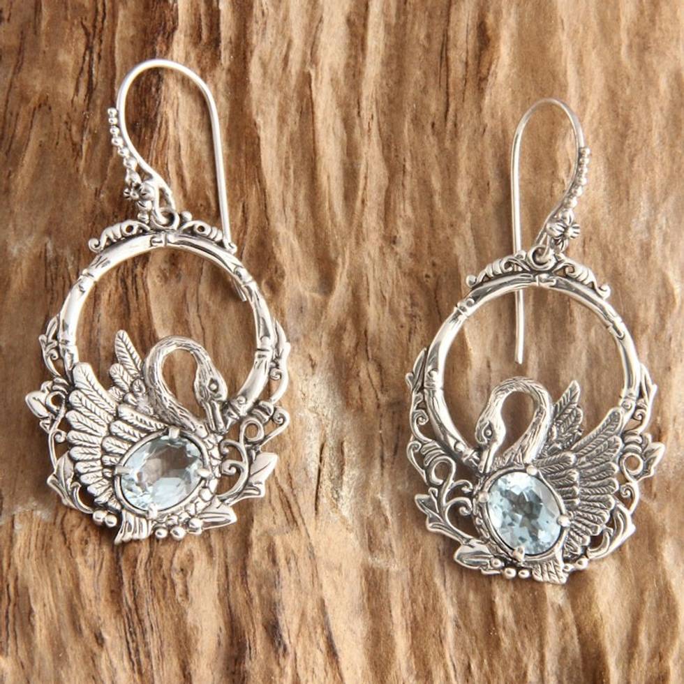 Handmade Sterling Silver and Blue Topaz Bird Earrings 'Dancing Swan' Item ID: 2669923303