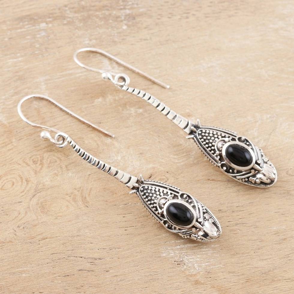 Handmade Sterling Silver and Onyx Drop Earrings 'Magical Snake' Item ID: 2671789167