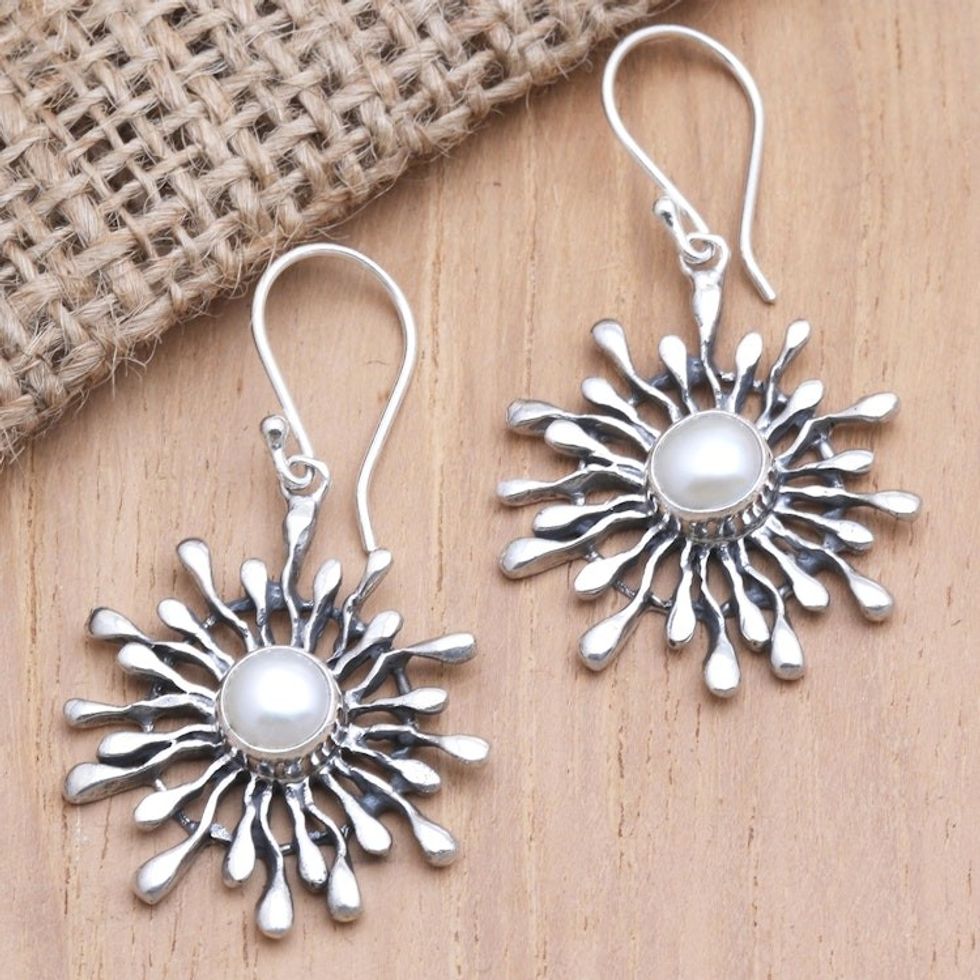 Handmade Sterling Silver and Pearl Dangle Earrings 'Radial Pearl' Item ID: 2671745277