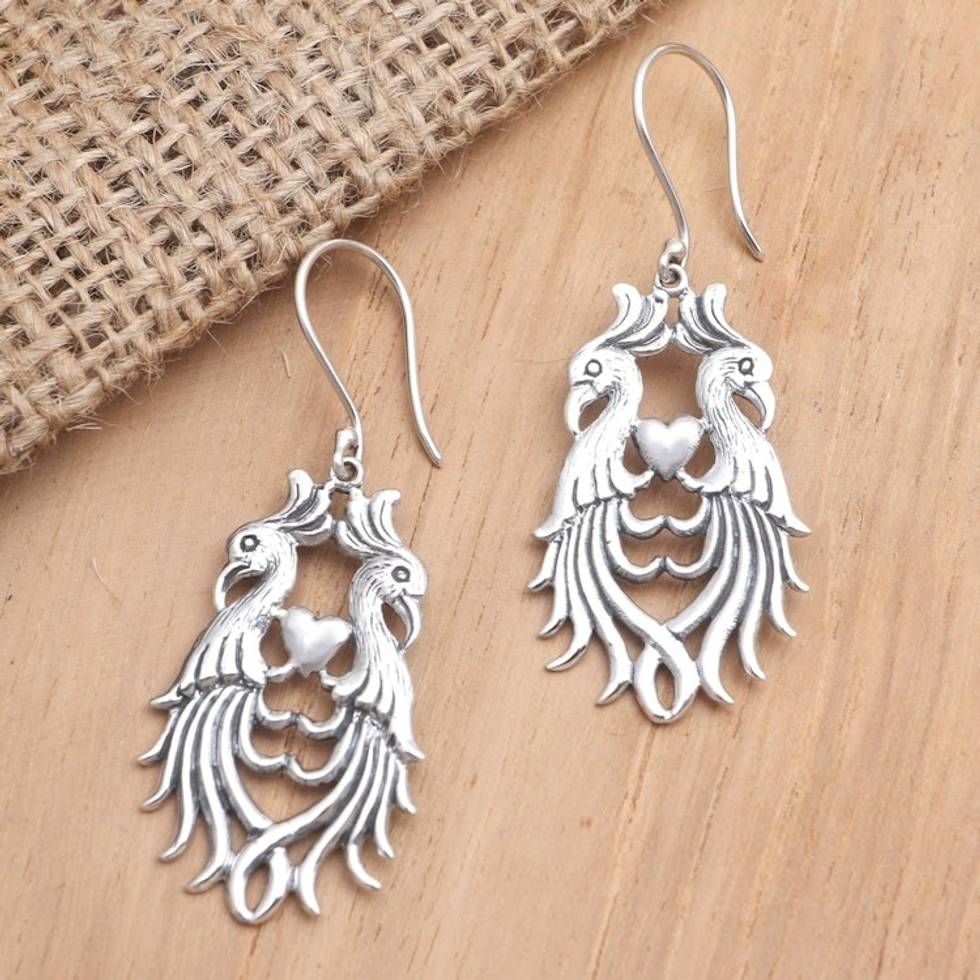 Handmade Sterling Silver Bird-Motif Dangle Earrings 'Winged Hearts' Item ID: 2671745413