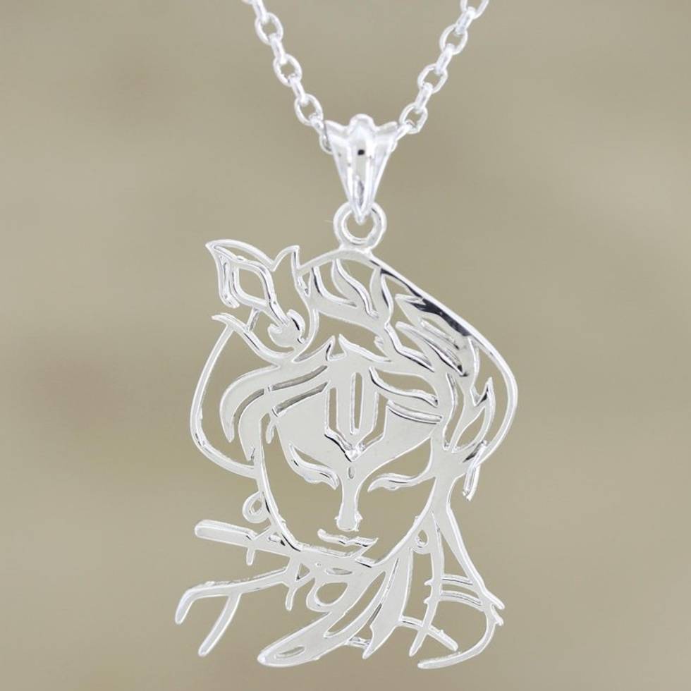 "Indian artisan Anant designs this pretty pendant necklace featuring Lord Krishna, the Hindu god of compassion, tenderness, love. Crafted from sterling silver, the pendant is created with an openwork design and swings on a sleek, shining cable chain."