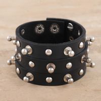 "Add some edge to your outfit with Indian artisan Deepika Lohani's studded cuff bracelet. Designed for both men and women, the cuff is hand crafted from wide strips of black leather and embellished with nickel-plated iron studs. Two row of snap buttons let you adjust the size to fit your wrist."