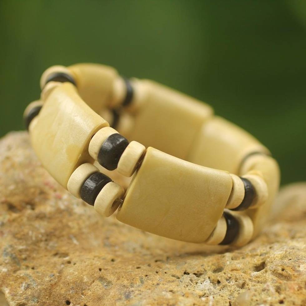 Handmade Wood and Recycled Bead Stretch Bracelet 'Cream Connection' Item ID: 2671800989