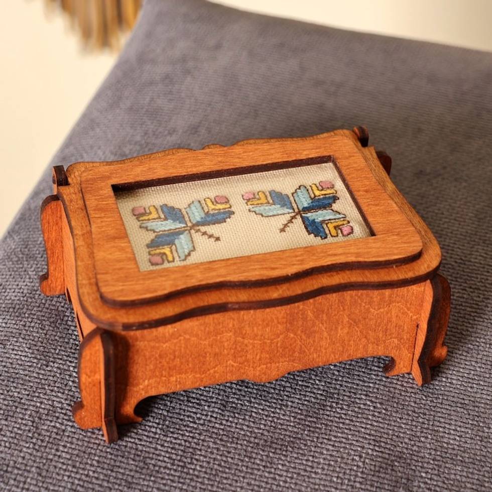 Handmade Wood Jewelry Box Topped by Lovely Embroidered Motif 'Blue Butterflies' Item ID: 2669941735
