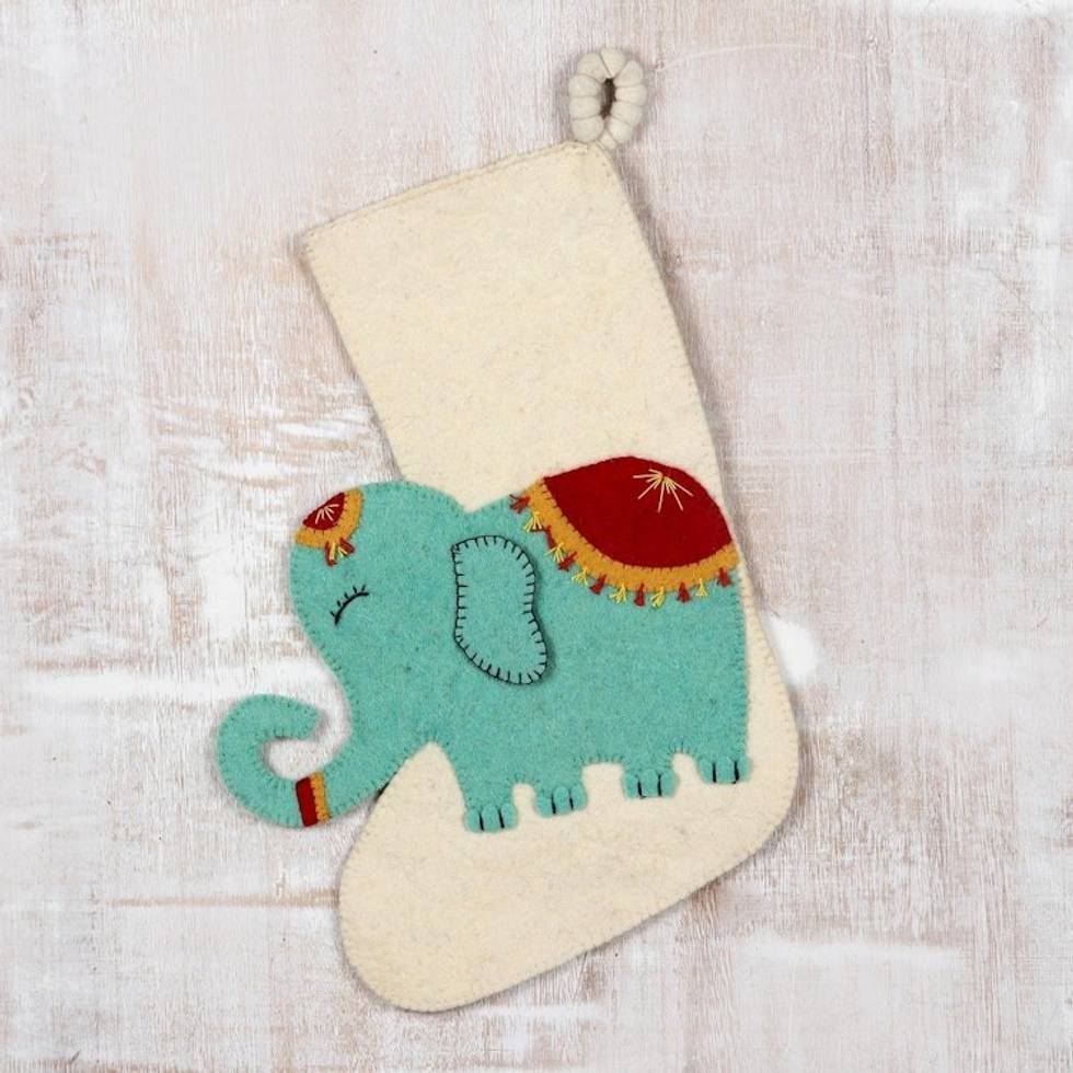 Handmade Wool Christmas Stocking 'Festive Elephant in Ivory' Item ID: 2671789416