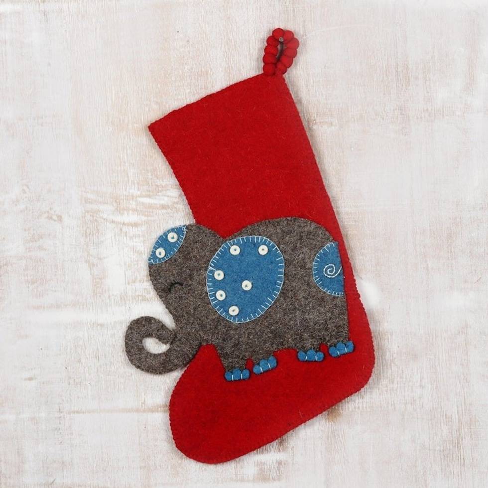 Handmade Wool Christmas Stocking 'Festive Elephant in Red' Item ID: 2671789560