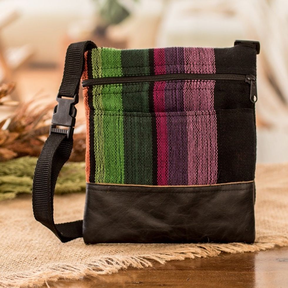 Handwoven Adjustable Striped Leather-Accented Cotton Sling 'Earth Traveler' Item ID: 2671768882