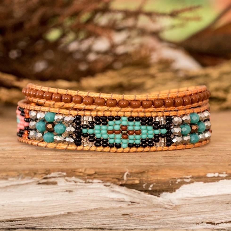 Handwoven Beaded Brown Wrap Bracelet with Geometric Motifs 'Geometric Spark' Item ID: 2671626804