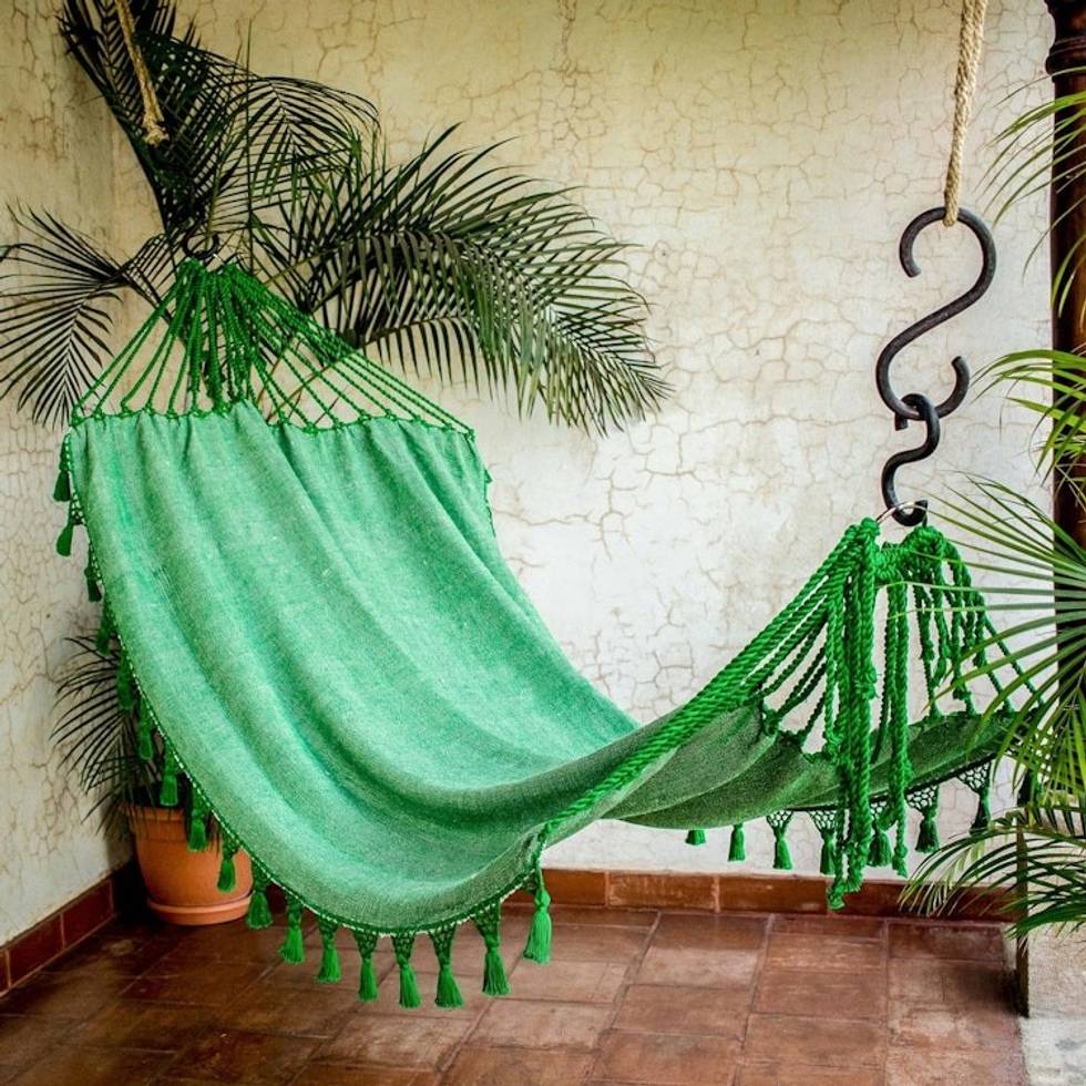 "Woven of cotton on a traditional foot pedal loom, this viridian-hued single hammock is the pride of designer Estuardo Cofino in Guatemala. The sturdy and comfortable fabric hammock features crocheted details and tassels that trim both sides. With sturdy ropes and galvanized S-hooks, the hammock is ready to become your favorite lounging spot."