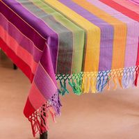 Handwoven Fringed Cotton Tablecloth with Colorful Stripes 'Vibrant Rainbow' Item ID: 2671625974