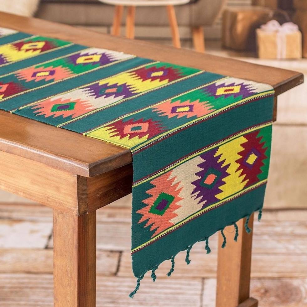 Handwoven Green Cotton Table Runner with Guatemalan Motifs 'Colorful Stars' Item ID: 2671768892