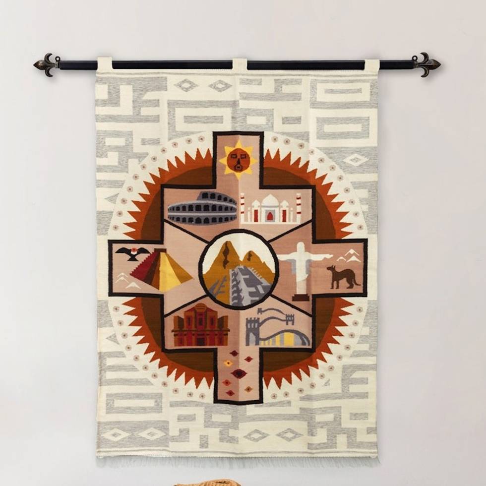 "The world unites in an inspirational depiction of the wonders of humanity, sending a message of peace and unity to humankind. Artisan Fredy Huaman spreads this message of harmony in this wool and cotton blend tapestry handwoven with traditional Andean techniques that allow for an exquisite finish, portraying each of the most beautiful scenarios of the world arranged in a chakana symbol, a sign used by the Inca Empire to represent the union between the divine, human and spiritual worlds."