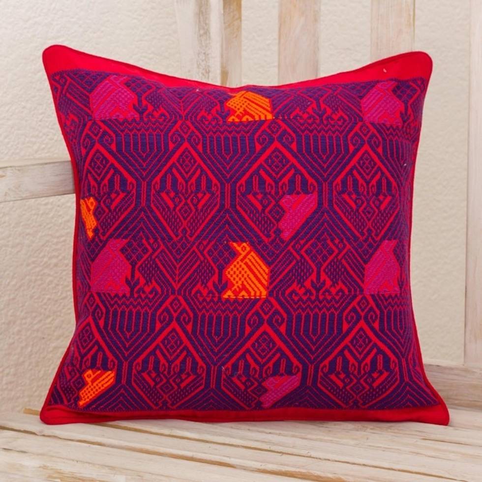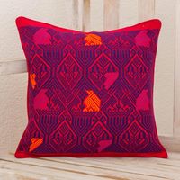 Handwoven Maya Backstrap Loom Red and Purple Cushion Cover 'Birds in Color' Item ID: 2671779885