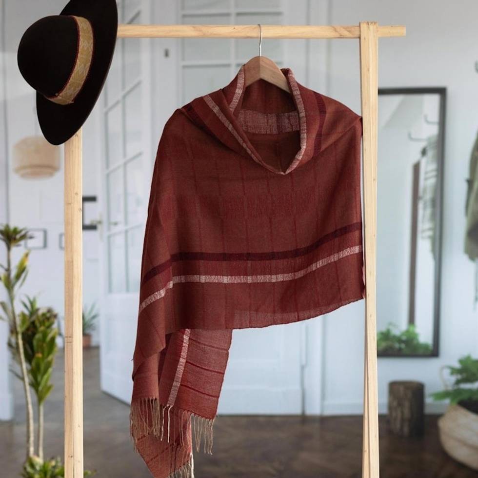 Handwoven Patterned Burgundy and Brown Baby Alpaca Shawl 'Burgundy Windowpanes' Item ID: 2671401332