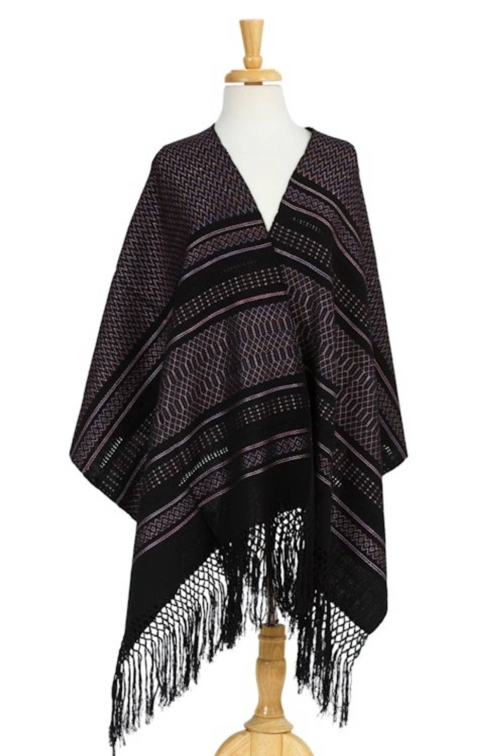 "Handwoven of black cotton with pink and lilac stripes and patterns, this elegant shawl from Mexico is designed by Delfina Ruiz. She works on the foot pedal loom to create the psychedelic designs, completing the accessory with long, elegant fringes."