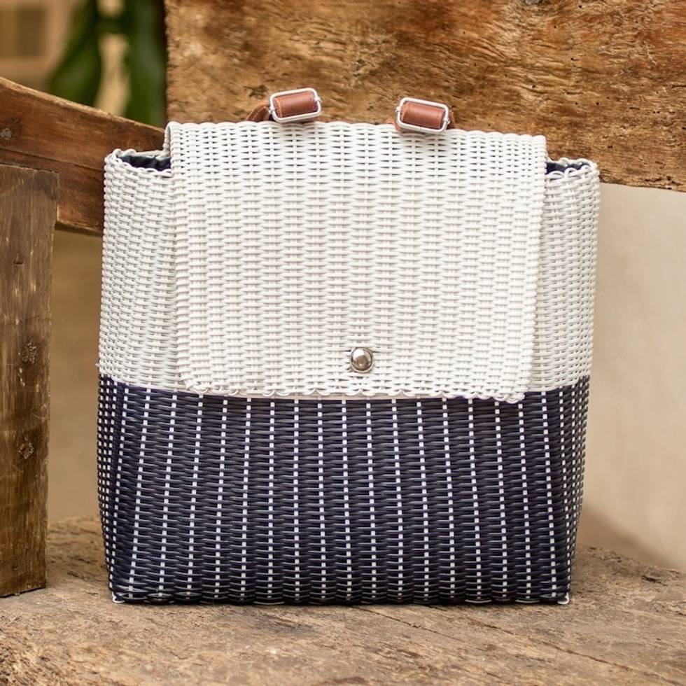 Handwoven Recycled Vinyl Cord Backpack with Leather Straps 'Midnight Creation' Item ID: 2671771629