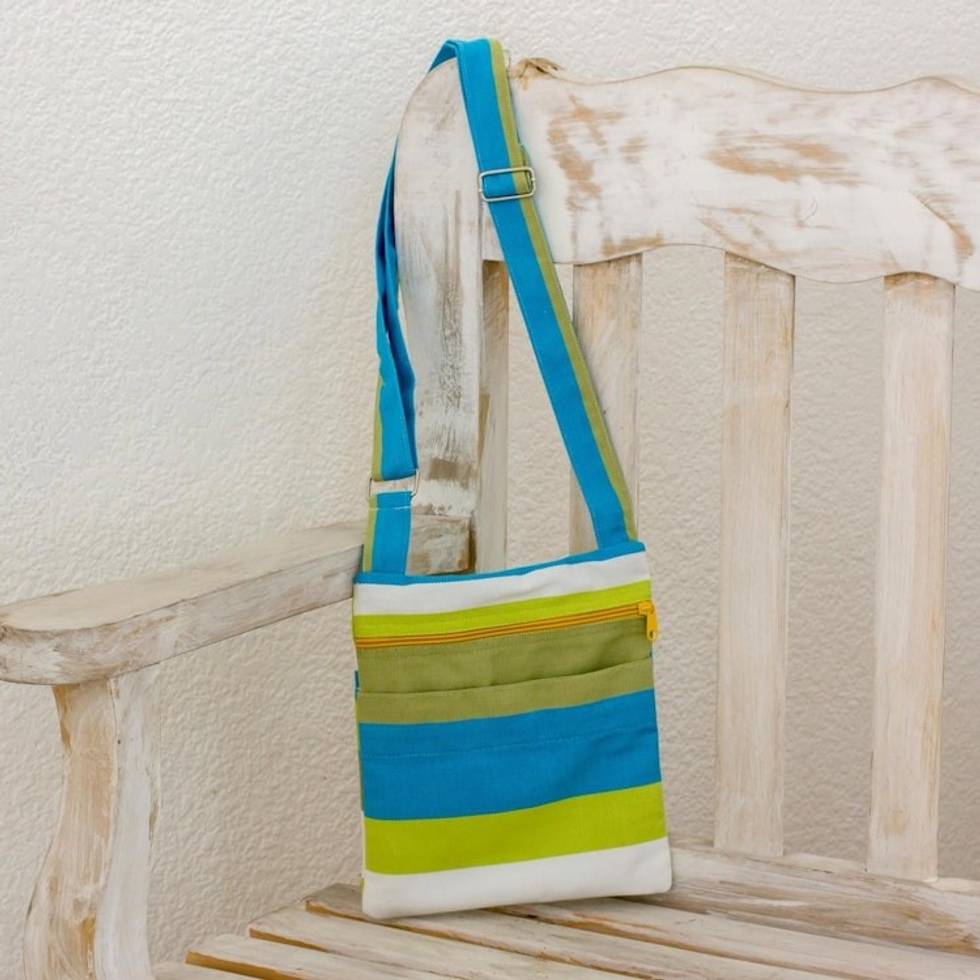 Handwoven Striped Cotton Sling Handbag from El Salvador 'Citron Combination' Item ID: 2671778526