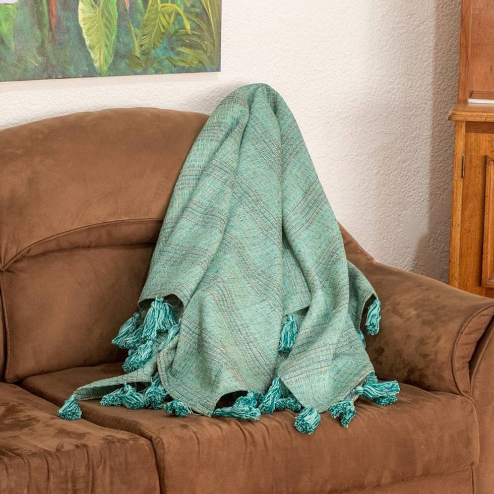 Handwoven Striped Cotton Throw in Aqua and Teal with Tassels 'Reef Inspiration' Item ID: 2671770416